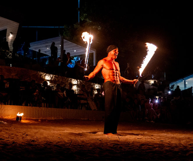 Once a week, the beach transforms into the ultimate party scene with our Beach Party & Fire Show. Dance under the stars, sip on refreshing cocktails, and witness a spectacular fire performance, making for an unforgettable night by the sea.
